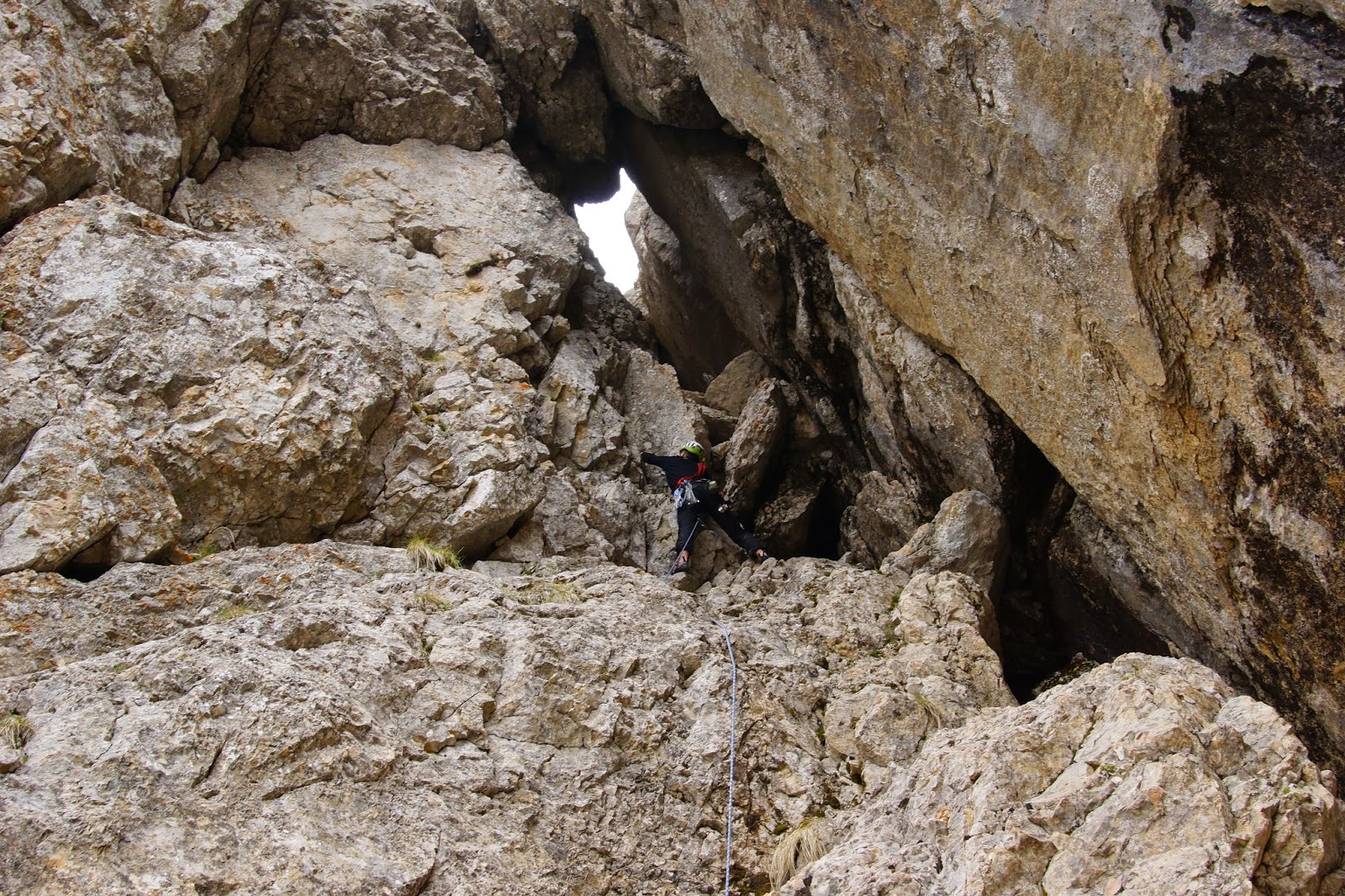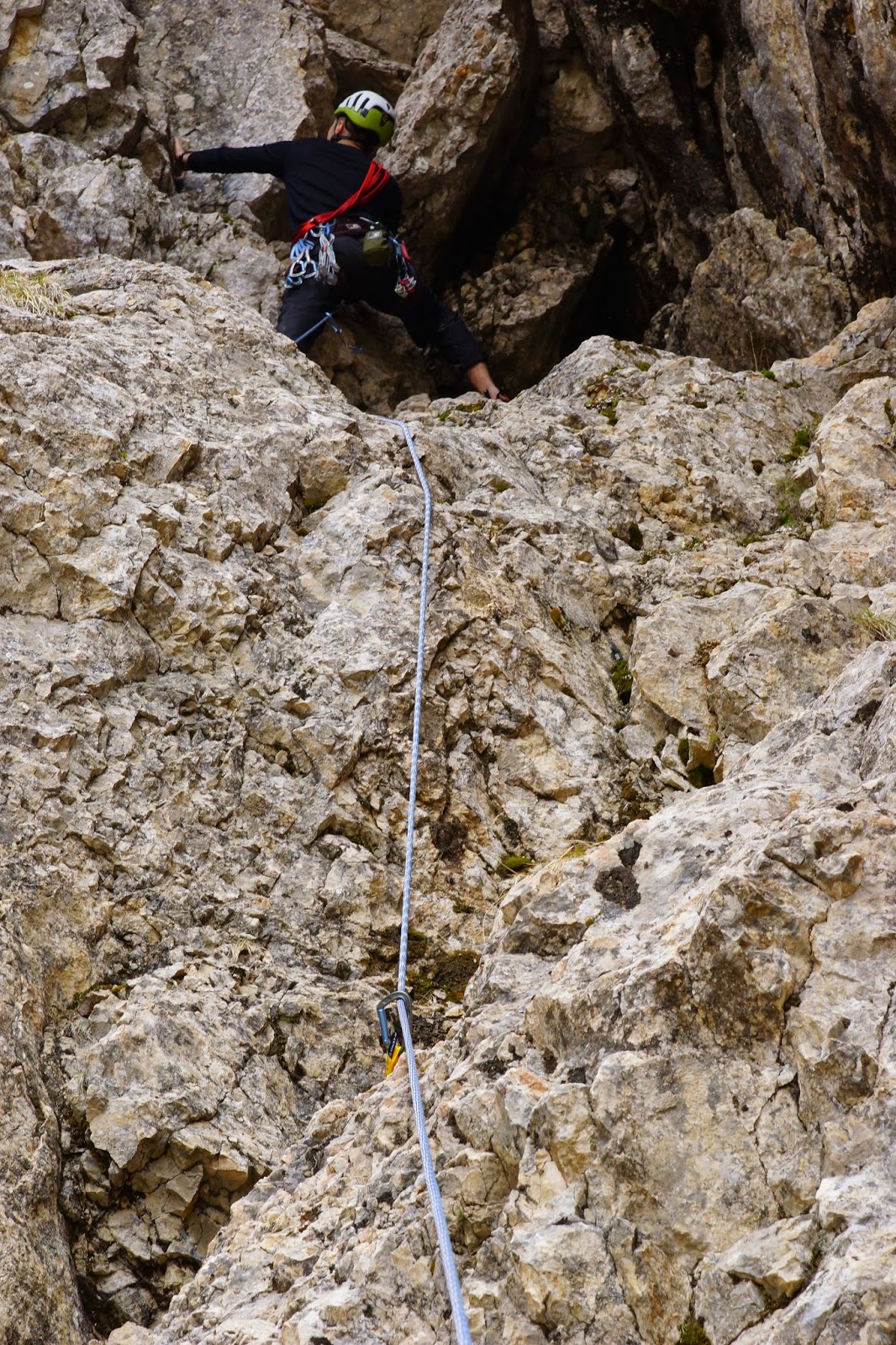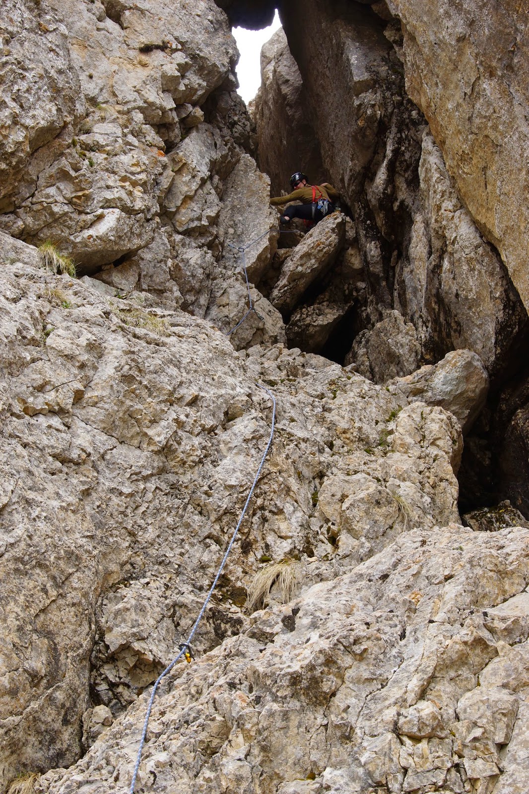Поднялись вплотную к расщелине и полезли на страховке.
