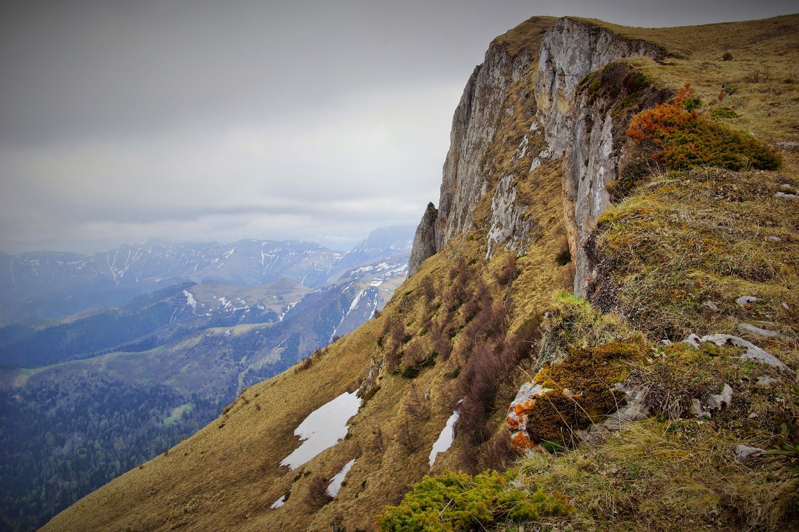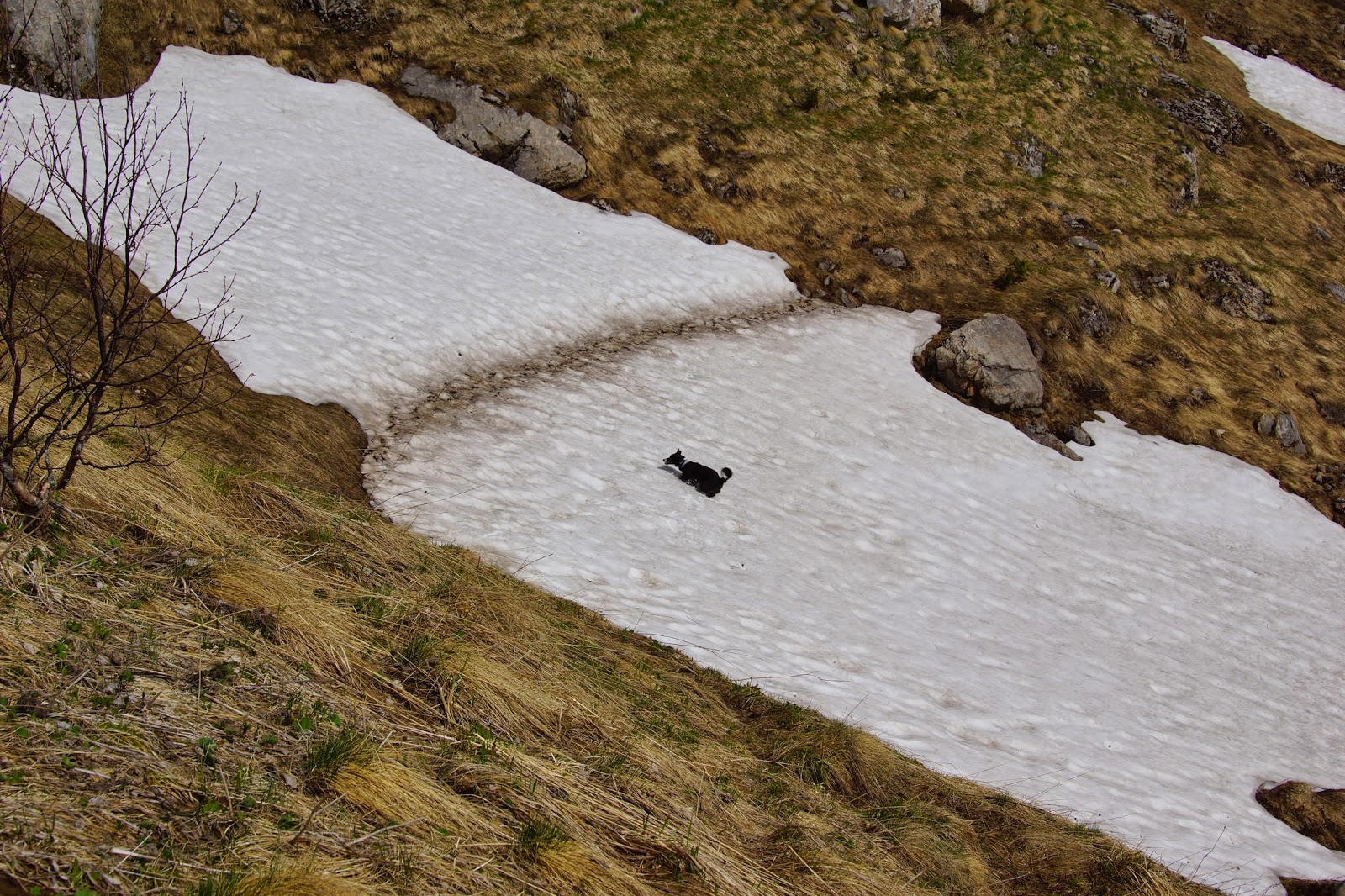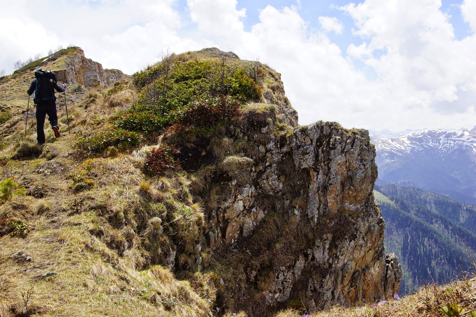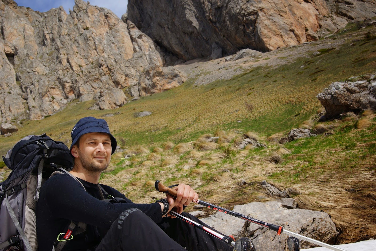 С верху скала выходит на крутой травянистый склон со снегом, были бы с собой ледорубы можно было бы взять Тхач влоб! Но так как мы планировали только тренировку, особо не расстроились и вдоволь налазившись продолжили путь на вершину в обход.