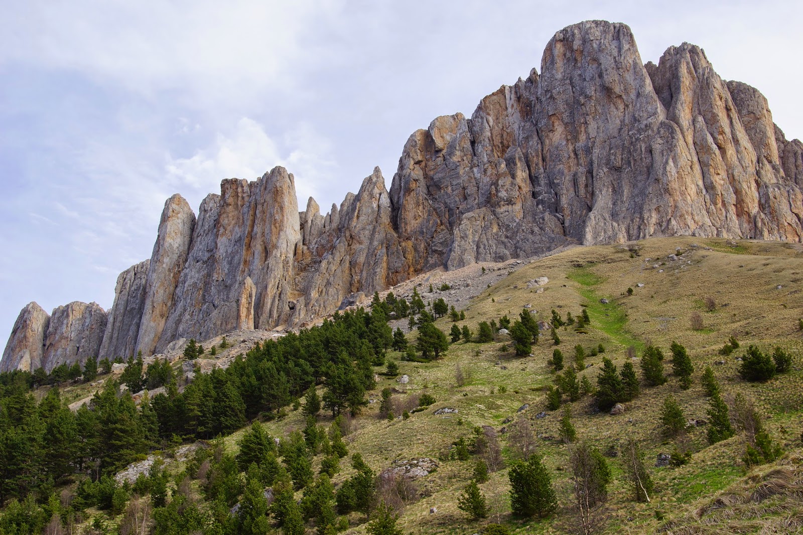 От скалы уходим вправо, дальше тропа идет вдоль стены Большого Тхача. Цель сегодняшнего дня - Балаган Ветреный, там планируем встать базовым лагерем.